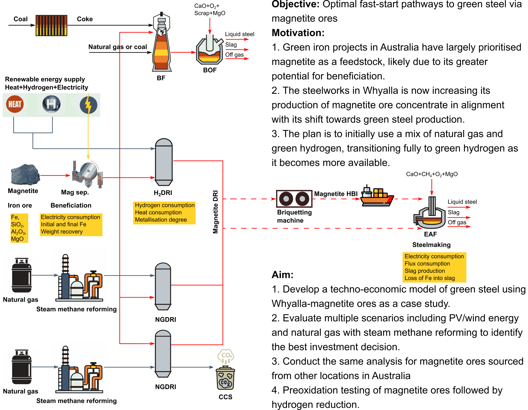 The research will adopt a phased strategy, using natural gas DRI (NGDRI) initially, then shifting to full hydrogen-based production. The project will characterise magnetite ores supplied by industry partners and compare end-to-end costs of magnetite-derived green iron and steel with costs using hematite-goethite ores.
